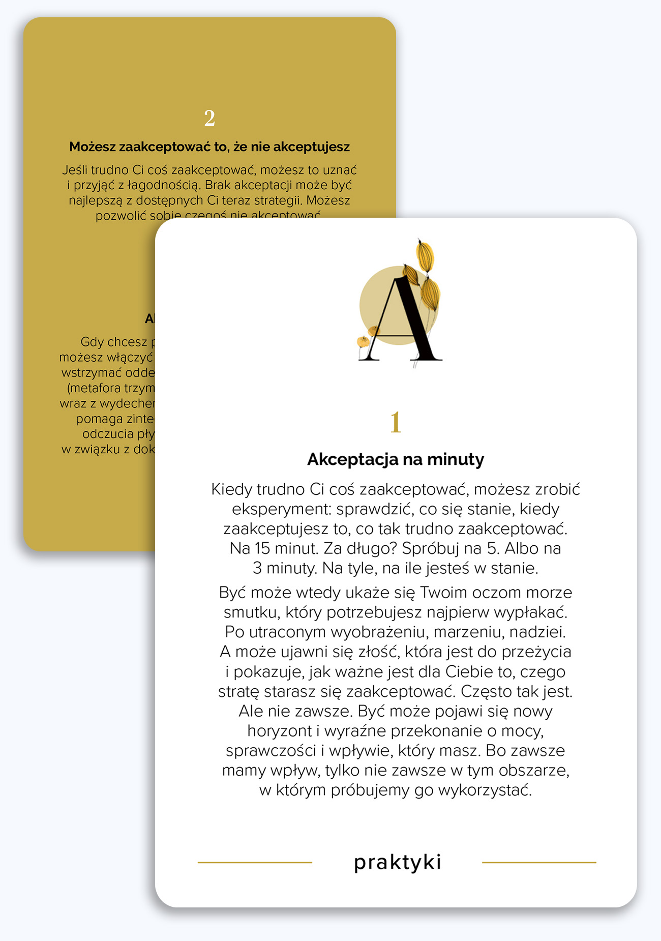 Zestaw zawiera po dwie karty na każdą literę alfabetu. Pod każdym hasłem znajdziesz objaśnienie wybranego zagadnienia oraz praktyki. Karta praktyk zawiera wskazówki, które mogą pomóc rozwijać określone postawy, ćwiczyć umiejętności lub wprowadzać do codziennego życia sposoby na bycie w kontakcie ze sobą i z innymi ludźmi, niezależnie od ich wieku.